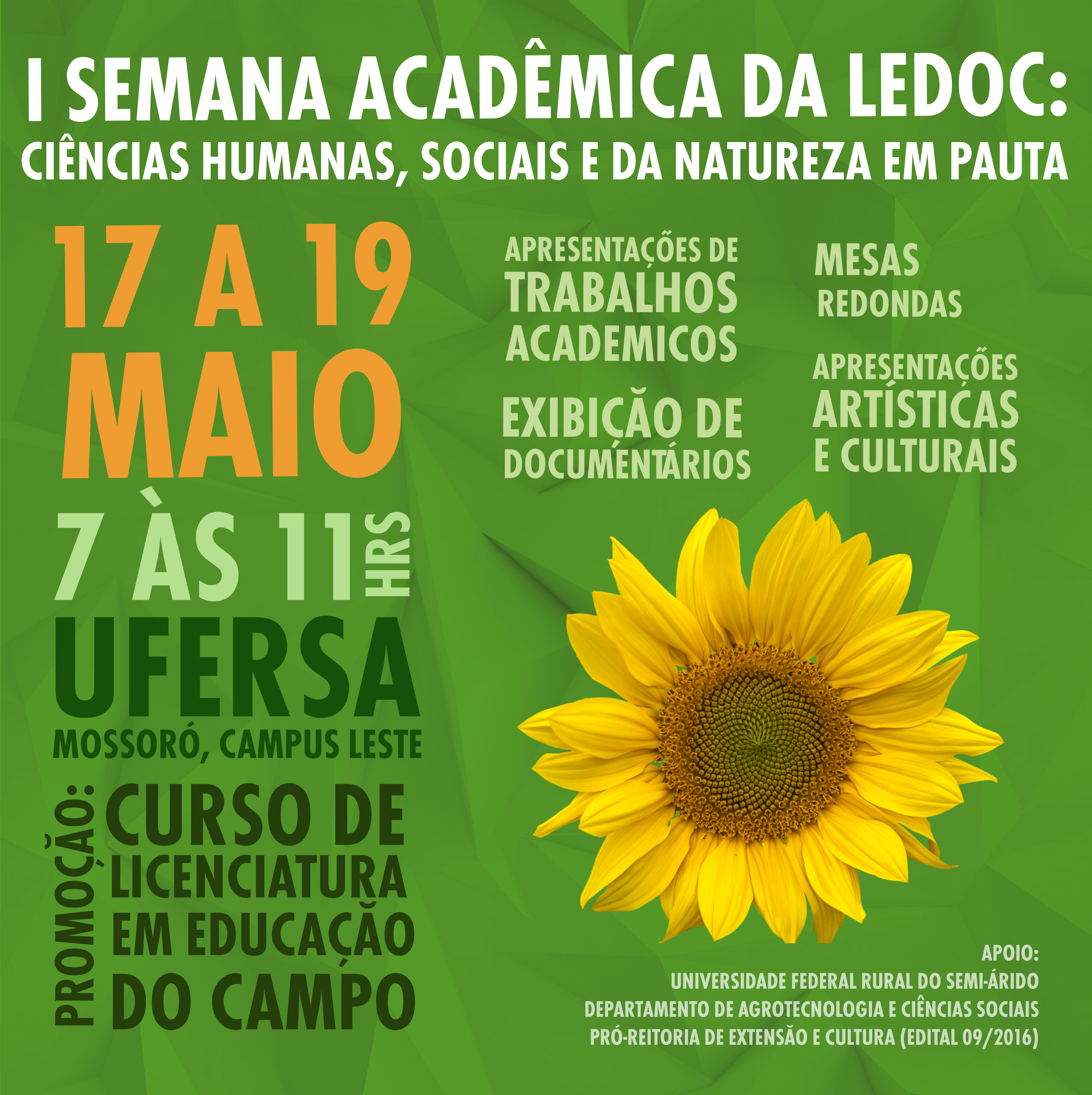 O Curso de Licenciatura Interdisciplinar em Educação do Campo em parceria com o Departamento de Agrotecnologia e Ciências Sociais torna público a I Semana Acadêmica da Licenciatura Interdisciplinar em Educação do Campo (LEDOC) , coordenado pela Profª. Kyara Maria de Almeida Vieira, que será realizado de 17 a 19 de maio de 2016.