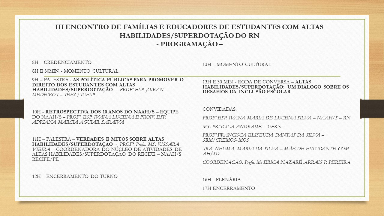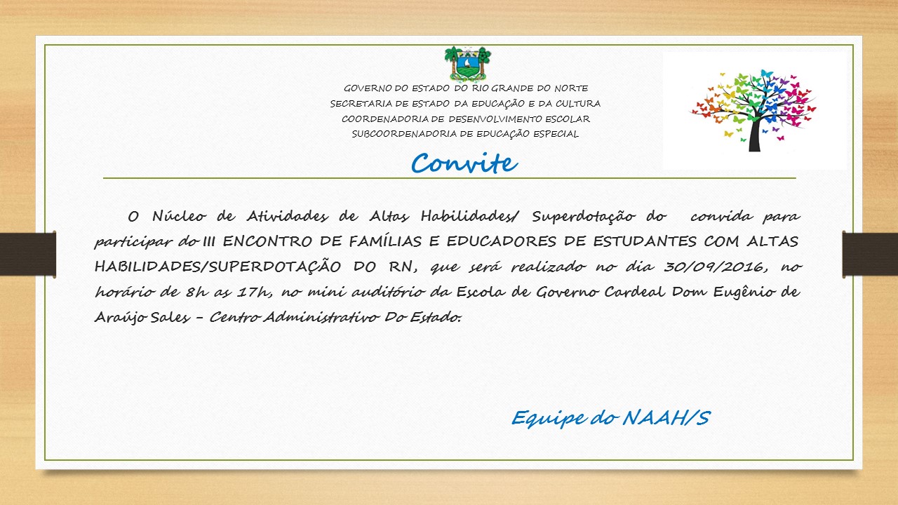 A Secretaria do CCSAH vem contribuir na divulgação ampla do convite para participação do evento que o NAAH/S-RN estará realizando no próximo dia 30 de setembro de 2016. A sua presença é muito importante.