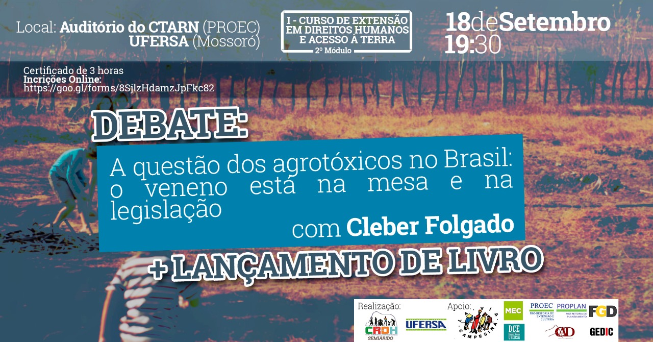 O Centro de Referência em Direitos Humanos da Ufersa promoverá, entre os dias 18 e 22 de setembro, o segundo módulo do I Curso e Extensão em Direitos Humanos e Acesso à Terra. O curso faz parte do Proext CRDH e, nesta etapa, serão abordados os temas Agrotóxicos e Violações de Direitos Humanos, com assessoria de Cleber Adriano Folgado, advogado, membro da Campanha Permanente Contra os Agrotóxicos e Pela Vida e do Movimento de Pequenos Agricultores, e Questão Agrária e Direito Humano à Terra, que será ministrado pela professora dra. Érika Macedo, da Universidade Federal de Goiás.