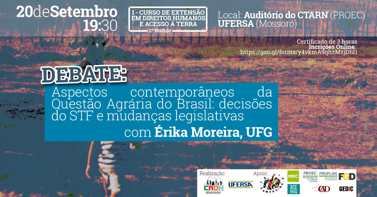 O segundo, no dia 20/09 (quarta-feira), será a palestra “Aspectos contemporâneos da questão Agrária no Brasil: jurisprudência do STF e mudanças legislativas”, proferida pela professora Érika Macedo. Os dois eventos acontecerão às 19:20.