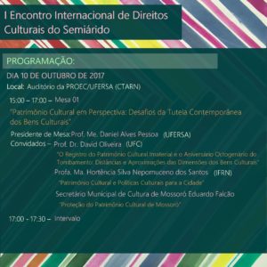 Na ideia de promover o intercâmbio com pesquisadores do Direito de outras nacionalidades e em virtude do aniversário de vigência nacional do instituto do tombamento, o evento contará com conferência de abertura do Prof. Dr. José Luís Bonifácio Ramos da Faculdade de Direito da Universidade de Lisboa, no dia 09 de outubro, às 19 horas, no auditório da PROEC/UFERSA (CTARN). Para discutir a influência da atual crise política e econômica brasileira sobre a garantia dos direitos culturais pela Constituição Federal de 1988, o evento conta ainda com a presença do Prof. Dr. Francisco Humberto Cunha Filho, coordenador-líder do Grupo de Estudos e Pesquisas em Direitos Culturais – GEPDC da Universidade de Fortaleza, na conferência de encerramento, no dia 11 de outubro, às 18:30h, também no Auditório da PROEC.