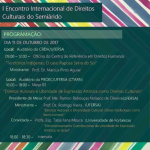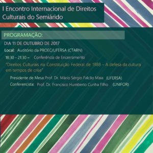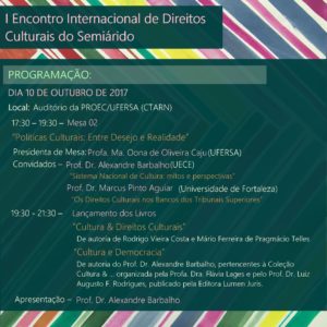 O Encontro pretende introduzir no Semiárido Potiguar reflexões e experiências acerca dessa parcela dos direitos humanos ainda tão pouca desenvolvida, bem como evidenciar a centralidade dos direitos culturais no mundo contemporâneo com sua proteção constitucional e internacional e como objeto de atenção de políticas públicas. Para tanto, o evento trará, em suas conferências, mesas, oficinas e lançamento de livro, espaço diverso para debates sobre a legislação cultural brasileira acerca da proteção do patrimônio cultural e da memória coletiva, da liberdade de expressão cultural e artística, dos direitos de autor, das políticas culturais, da proteção de povos e comunidades tradicionais, além da especial atenção sobre a garantia constitucional dos direitos culturais em tempos de crise política e econômica e de violações acentuadas de direitos humanos.