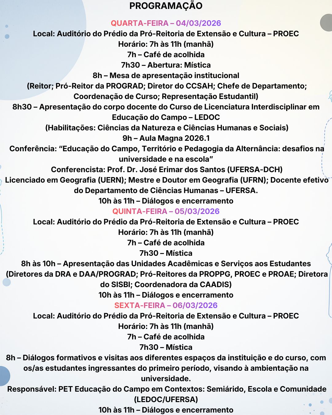 O curso de Licenciatura Interdisciplinar em Educação do Campo (LEDOC), da Universidade Federal Rural do Semi-Árido (UFERSA), convida estudantes ingressantes e veteranos para a Aula Magna e Acolhida do semestre 2026.1.